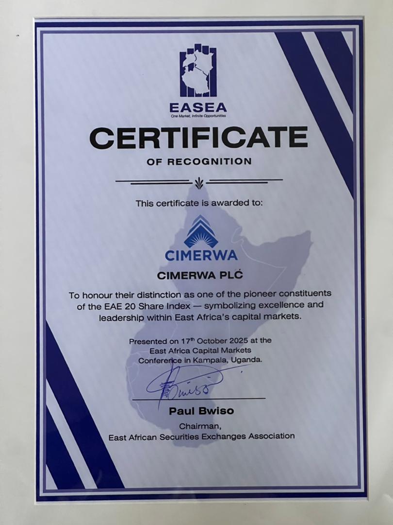 CIMERWA PLC is honored to be recognized as a pioneer constituent of the EAE 20 Share Index, reflecting excellence and leadership within East Africa’s capital markets.